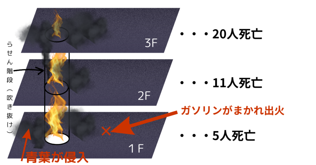 また、出火直後にトイレに逃げドアを閉めていた3人も最後の救助者として助かっている。