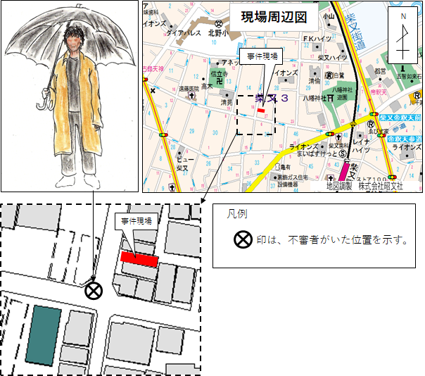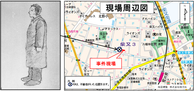 | 午後4時ごろ | 京成高砂駅付近で柴又3丁目への行き方を主婦に尋ねていた男と似ている、黒傘を差して現場近くに立っていた中年男 |