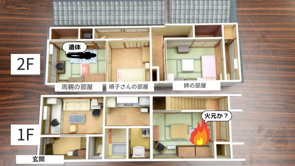 | 血液 | 2階にある仏壇の近くにあったマッチ箱が1階玄関付近に落ちていた。 そこからA型の血液が採取されている。被害者も含め家族にA型の人間はいない。 マッチ箱は犯人が火を付ける際、使用したとみられる。 |