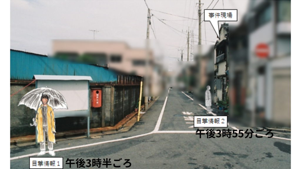 事件直前に現場付近で「コートを着た不審な男を見た」という目撃情報が2件寄せられている。